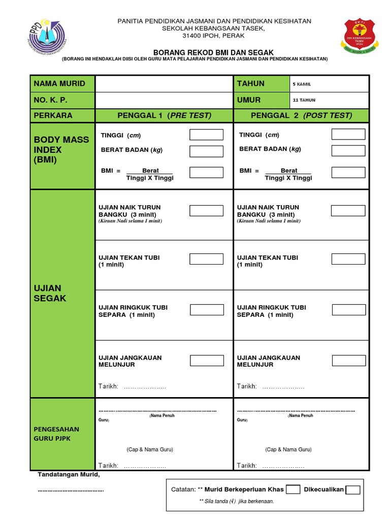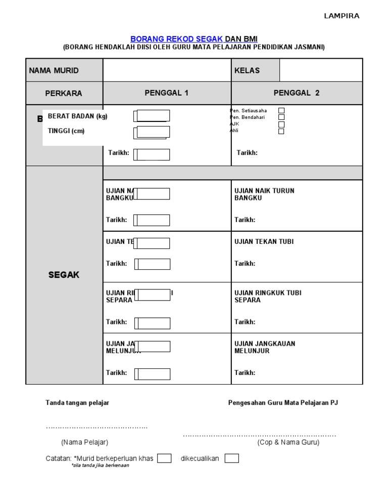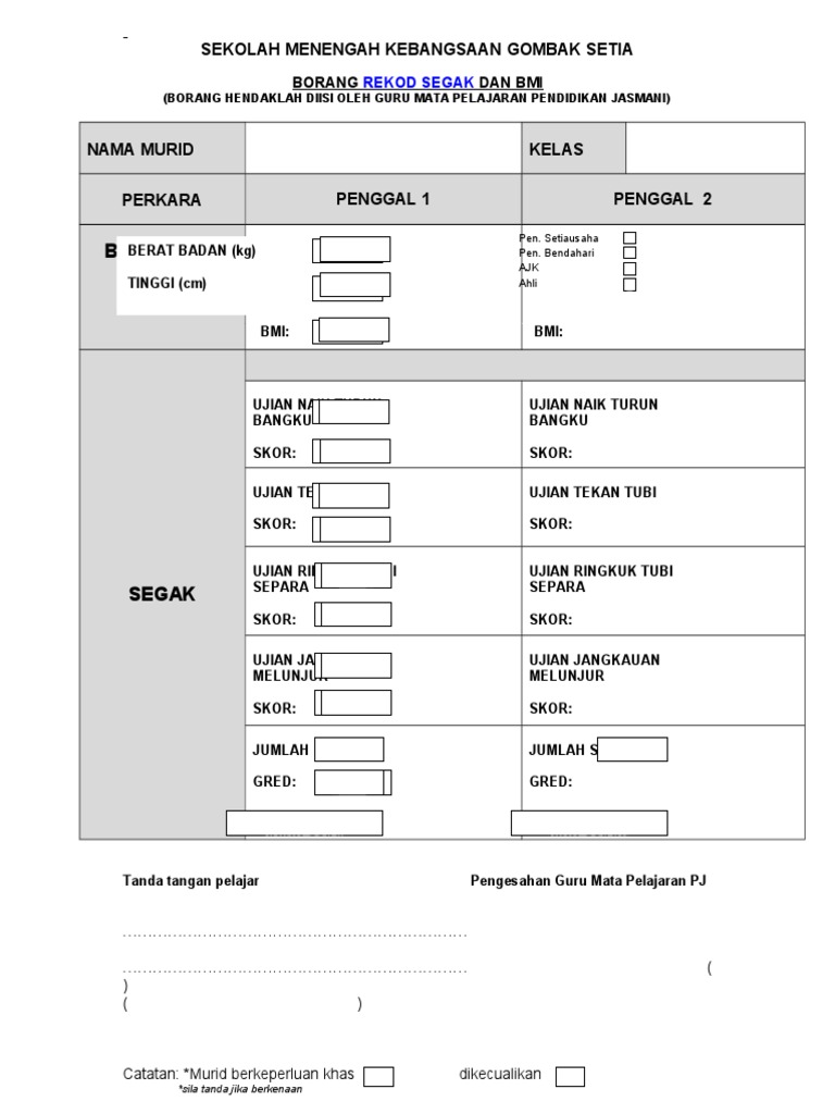 Doc Borang Rekod Segak Dan Bmi Borang Hendaklah Diisi Oleh Guru Mata Pelajaran Pendidikan Jasmani Simson Damus Academia Edu